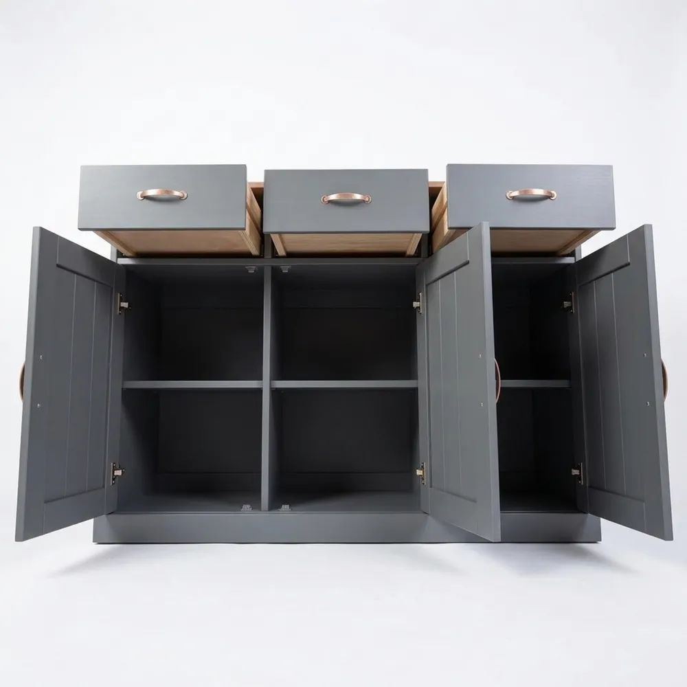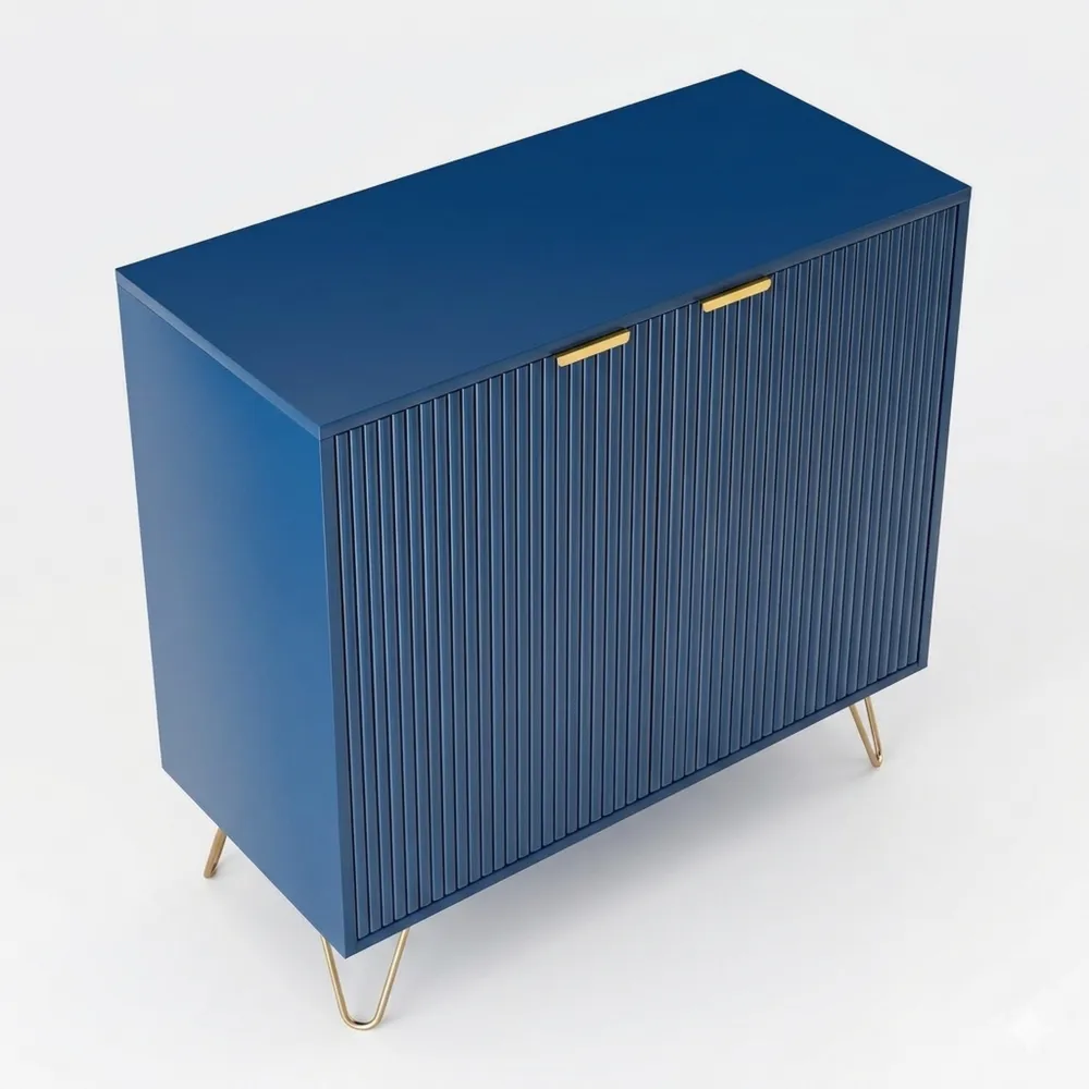 Die tiefblaue Farbgebung in Kombination mit champagnerfarbenen Metallfüßen vereint moderne Ästhetik mit Funktionalität. Mehrere Ablageflächen bieten ausreichend Platz für Kleidung, Bücher und Alltagsgegenstände und sorgen für ein aufgeräumtes Zuhause.